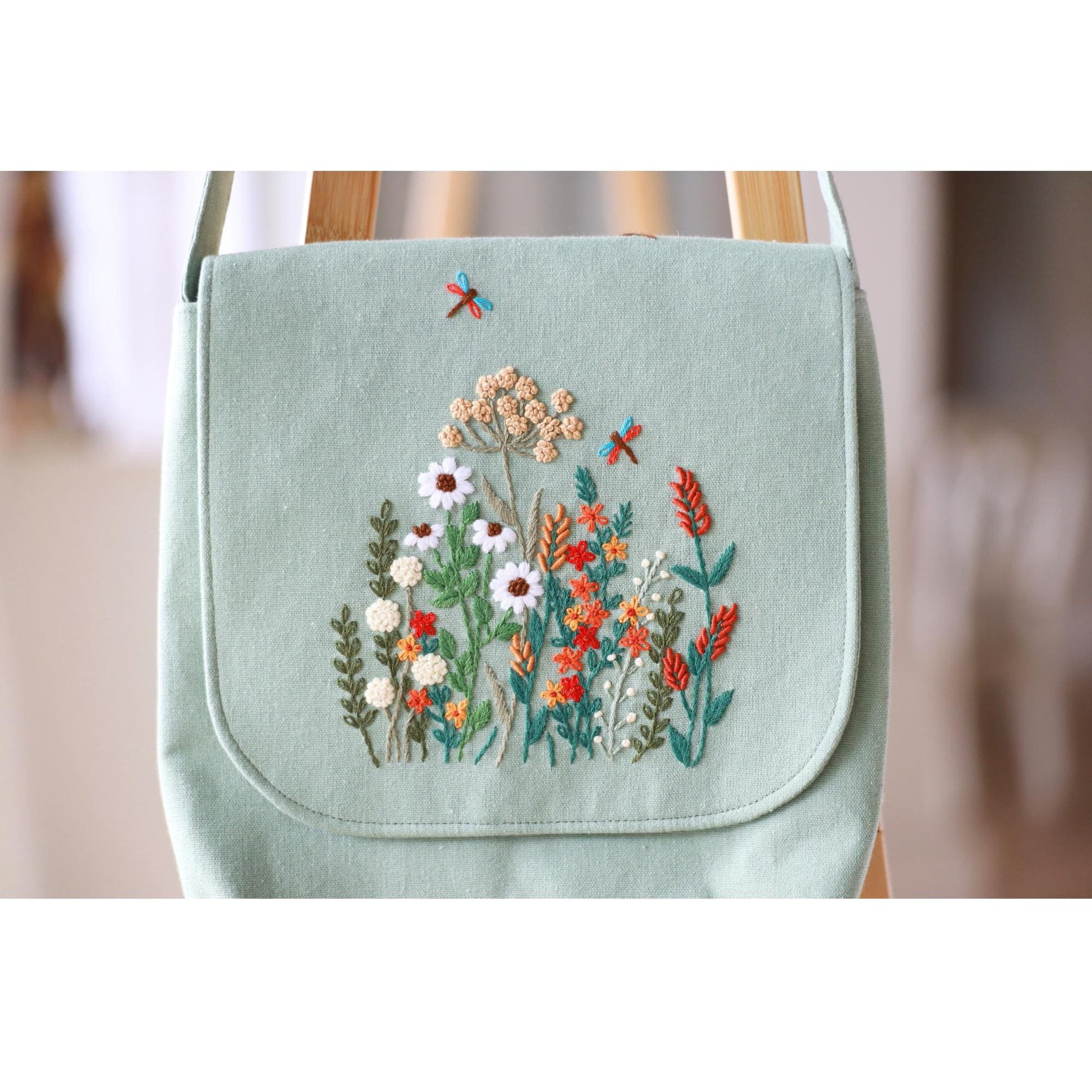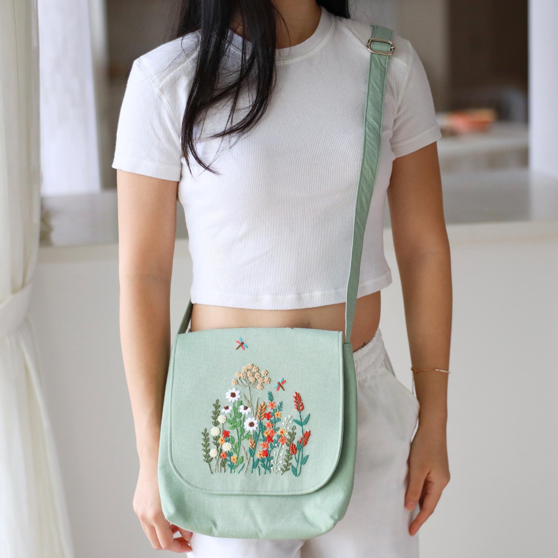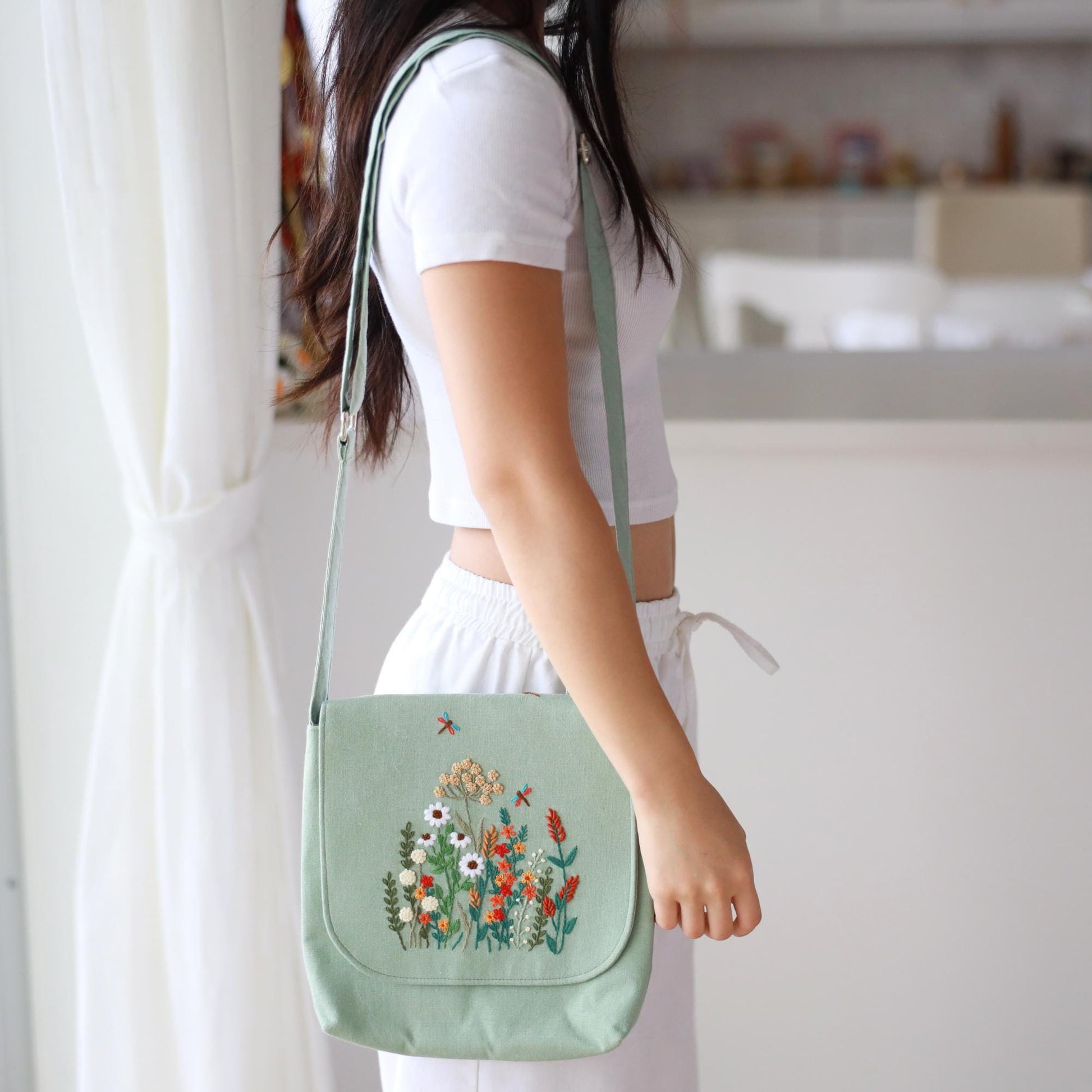 Carry the beauty of a wildflower meadow wherever you go with this hand-embroidered mint green crossbody bag. Carefully stitched with blooming wildflowers, tiny blossoms, and fluttering dragonflies, this bag is the perfect mix of charm and function. Handmade from durable linen and thoughtfully designed with structure in mind, it's lightweight yet roomy - ideal for daily errands, school, farmers markets, or brunch with friends.