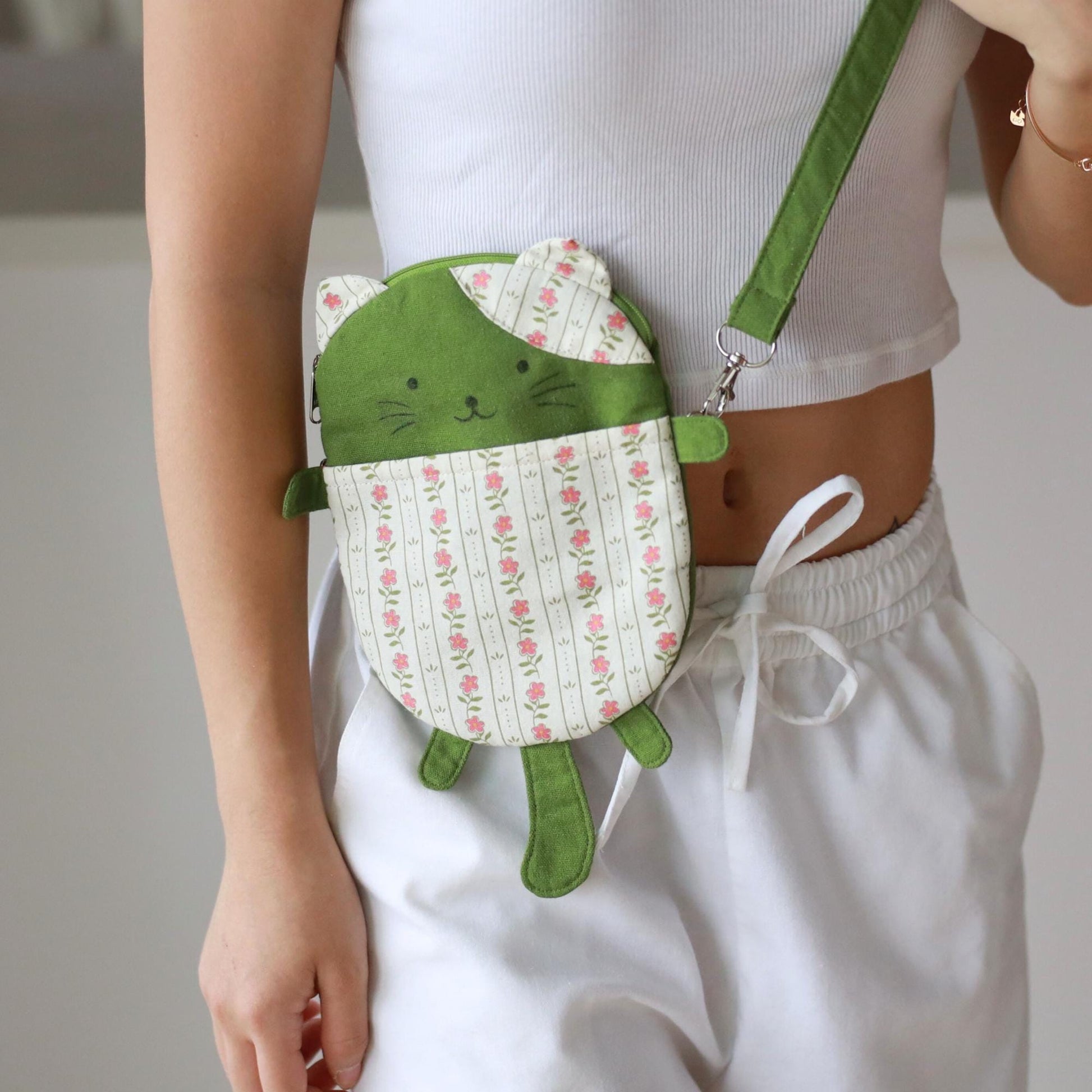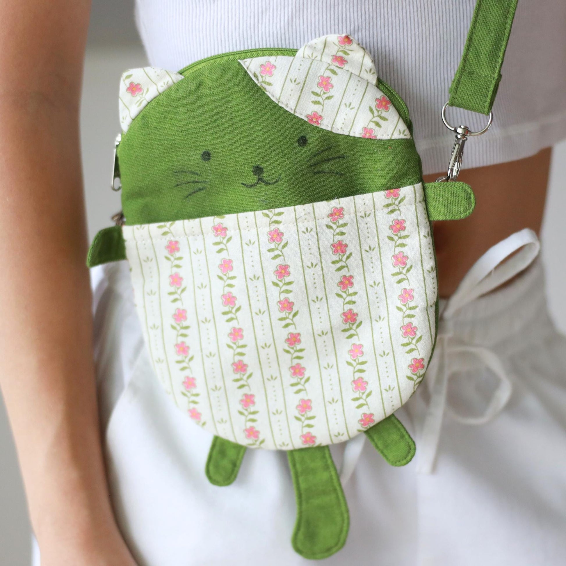 Meet the sweetest little companion to take everywhere with you! This handmade green cat crossbody bag is crafted with a mix of solid linen and floral cotton, featuring a charming kitty face, tiny paws, and a roomy front pocket. It's lightweight, playful, and the perfect everyday carry for anyone who loves cute accessories.